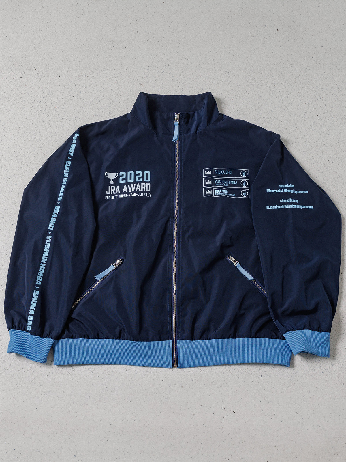 正面にはデアリングタクトの牝馬三冠の軌跡として、一冠・二冠・三冠の指もデザインしました。袖には優勝したレース名と松山弘平騎手の名前もデザインしました。勝負服カラーの水色が映えるブルゾンとなっております。